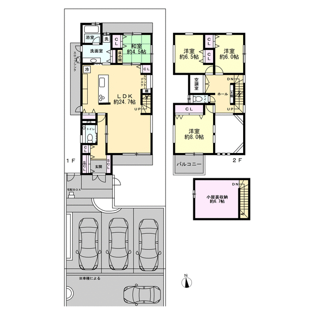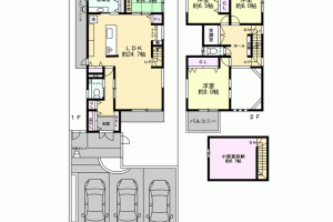 3台駐車可(車種による)で、来客にもばっちり対応できます!1階部分は約24.7帖のLDK、約4.5帖の和室、浴室等の水回りがあり、キッチンはペニンシュラキッチンで家事動線が良いだけでなく、開放的な空間を演出しております☆